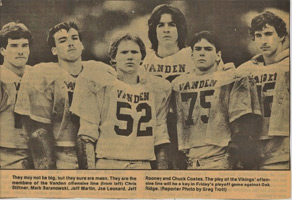Mark was our starting right guard and starting defensive tackle. He was 6'1" and 190 lbs. He was a two-way player who rarely left the field. Baro played on all specialty teams. I played football with Mark for five years and he played on three undefeated football teams, amassing a 45-4-2 winning record. In 1984, Baro was used as a pulling and trapping guard, and would hammer opponents relentlessly. He was the fastest offensive lineman we had. He was extremely aggressive. That season Baro was one of the best offensive/defensive combo players in Northern California. When Mark was not tormenting opposing teams, he was our team rebel and prankster. I am very grateful he was a Viking and not an opponent, because in 1984 he was as good as they came. Mark was my compadre. He was a master at taking names and couldn't be intimidated on the gridiron. In game #11 against Folsom, the second round of the playoffs for the Sac-Joaquin Section Title, Mark pulled left on a trap and hit their star defensive lineman. The hit was so hard and brutal it echoed in the open stadium at Vanden's George Gammon field. The following Monday when we watched game film, that hit was replayed over and over. When Baro hit an opposing player on a pull or trap it became a very bad day for them. I think his look in this photo says it all, he was a tough trencher, and those who tested him usually came out on the losing end. Prior to the 1984 season Mark worked out for a full year and spent the summer before Hell Week doing drills and running to get into shape with a group of us. That season in 1984 there is no one else in the state or country I would have wanted pulling right or left with me on a sweep, because I trusted Mark, and I knew the damage he was going to unleash on opposing players. Thanks for the memories, Baro. You took names.